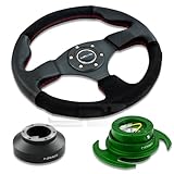 NRG-SRK-105H+012R-S+650GR, NRG Innovations 12.5" 320mm Black Leather Red Stitch Suede Grip Racing Steering Wheel Combo with 6 Hole Short Hub Adapter with Gen 3.0 with Handle Green Quick Release Kit SRK-105HNRG Quick Release features many options that conventional ball-locking quick release system do not. It is specially engineered with raised sections to prevent the scratching and stretching of the hub while a self locking feature adds increased safety and functionality. Features racing styled for added style and look. Each unit is made from the highest quality aircraft grade aluminum and is anodized for maximum durability and finish.