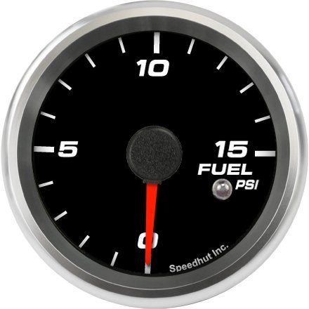 Speedhut 2-5/8" Fuel Pressure Gauge 0-15psi (w/ warning) Designed for the discriminating custom car builder looking for the ultimate in custom quality, easy to read 2-5/8 in. electronic fuel 0-15 psi gauge. Electronic so no mechanical diaphram is needed. Much safer than the old mechanical types. An internal microprocessor controls the needle movement through a digital stepper motor. The high torque of the stepper motor ensures accurate pointer movement without vibration in all race conditions. A high accuracy electronic (.5-4.5v) pressure transducer is included with the gauge for highest accuracy. Settable warning LED. Set low and high conditions. Peak memory recall shows both min and max peaks. A super thin (easy for gauge pods) composite carbon case design allows easy mounting in tight locations. Can be mounted in 2-1/16 in. or 2-5/8 in. gauge hole. Can be mounted in 2-1/16 in. gauge pod. Bright anodized solid Aluminum bezel! A unique Spin lock ring is included for ease of installation and a total custom look.